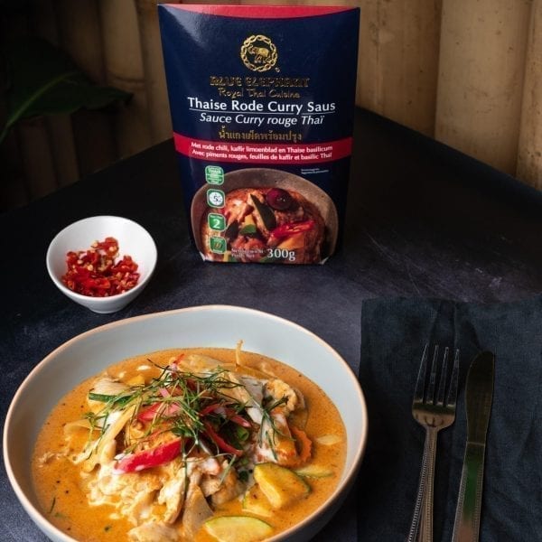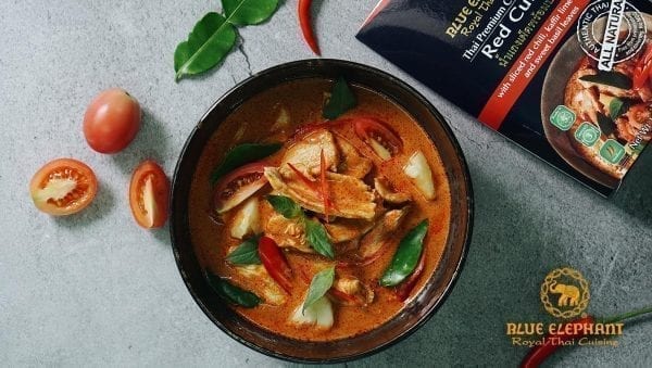 Blue Elephant Thai Red Curry Sauce is ready to heat and already contains Thai basil and Kaffir lime leaves to highlight your Authentic Thai Dish!